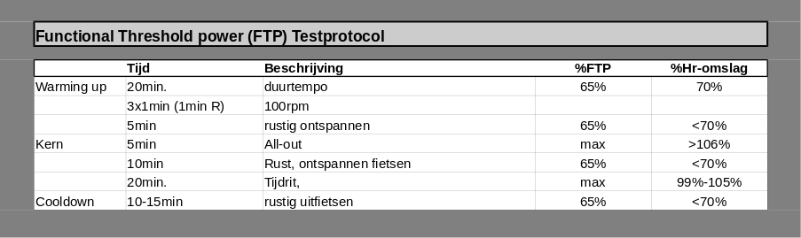 Tot slot de meest gebruikte, werkelijke test, is de 20-minuten test, een 20-minuten tijdrit waarbij je probeert de maximale prestatie gedurende deze 20 minuten te leveren. Vervolgens wordt het gemiddelde vermogen tijdens deze 20 minuten vermenigvuldigd met 0.95 en krijgt men de FTP-waarde.